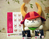 おみやげは、まるこむが一目惚れしてしまった彦根城のイメージキャラクターひこにゃんグッズ。 ぬいぐるみと、シールと、ピンバッジです。 |