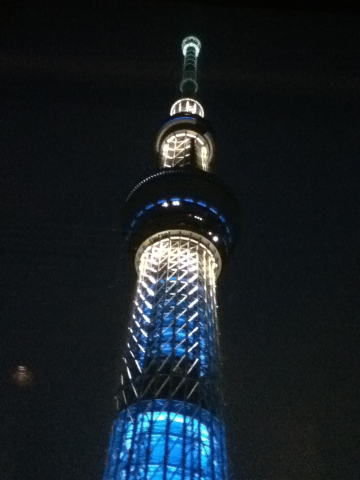 ライトアップは二種類あって、この日は隅田川をイメージしたブルーの光。