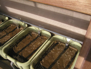 今年も四郎さんのお城の中に4つポットを用意して、お水が入るところと出るところをまるこむさんが組み立てました。そこに土を入れて、お水をたっぷり。