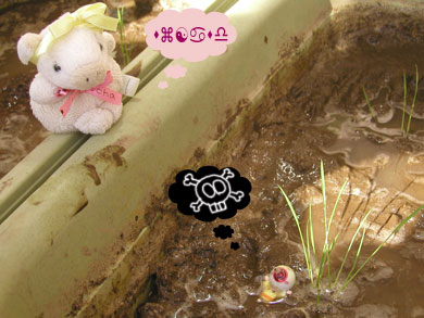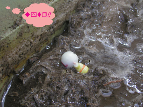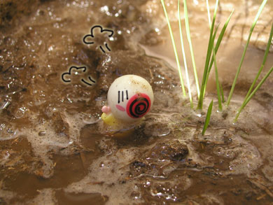 いつのまにか城に侵入していた目玉のおやじさんが田んぼに落ちてしまいました。