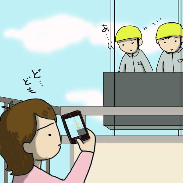 気づいたら、すっかり工事の方と目と目をあわせて…、しかもゴンドラはゆっくりゆっくりと降りていきます。
