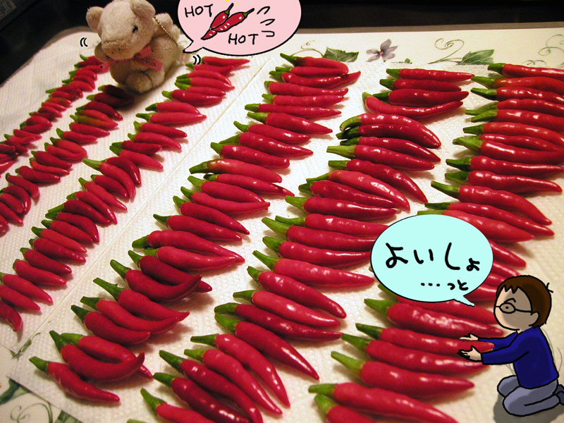三連休に雲場の池に行ってきました。 紅葉が見ごろ…、ちょっと遅かったかな。 でも、なかなか綺麗でした。 写真はmixiにもいっぱいアップしましたので、見てね。 それから、ベランダの唐辛子が今、大収穫時期になっています。 四郎の次ぐらいに手をかけたものなので、 まるこむはとっても嬉しそう。 机の上に小さい順に6列に並べて、見とれていました。 別に出荷するわけではないんですけども…。