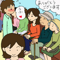 男の子はちょっとためらったあと席を立ち、女の子は二人が座れるように少し横に詰めると、老夫妻は彼等にお礼を言って二人並んでちょこんと、今譲られた席に腰掛けました。