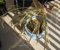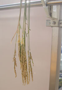 そして物干し竿に干された四郎。 一週間から10日後に、いよいよ脱穀です。 |
